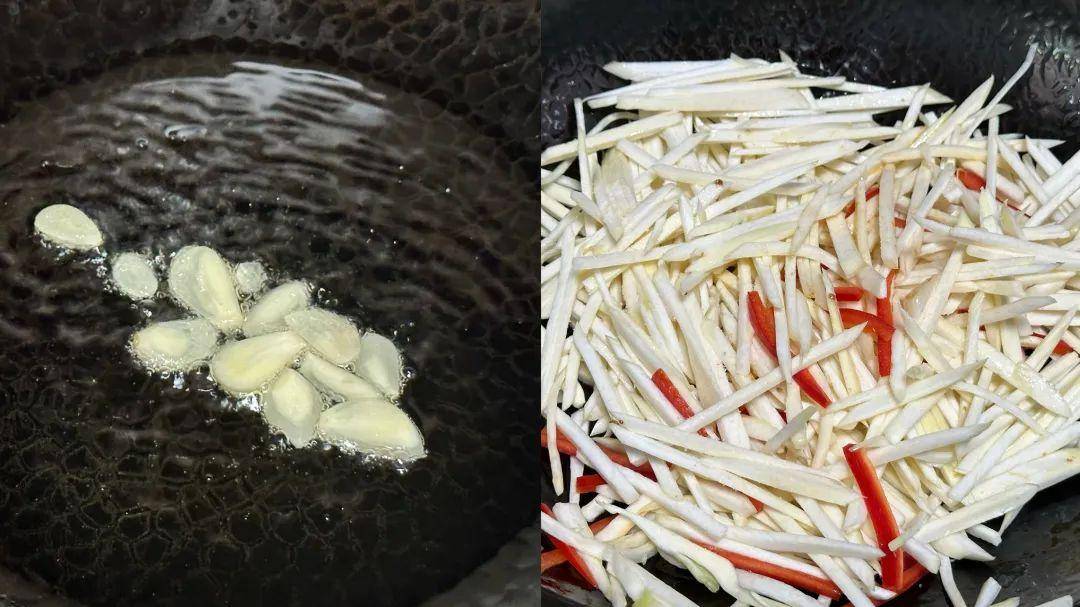 4、热锅凉油,下蒜片炒香,加入茭白丝和红椒丝翻炒;