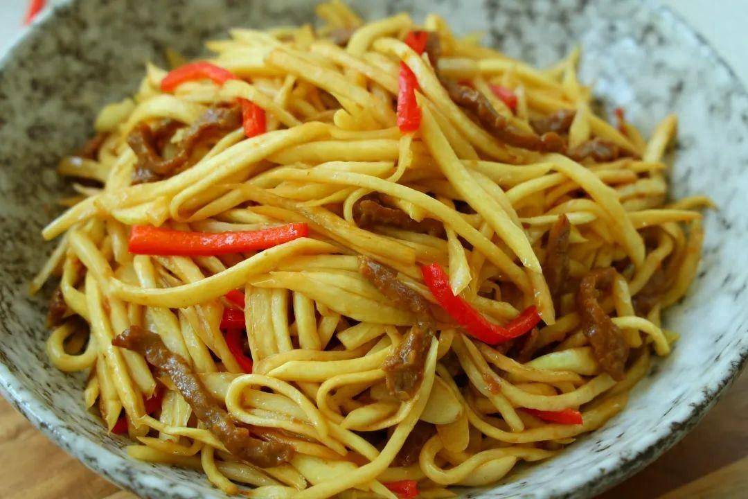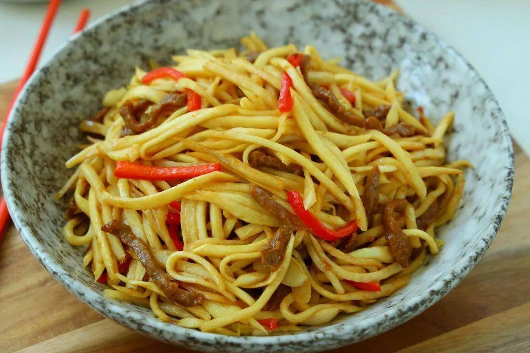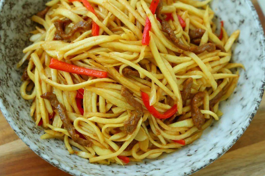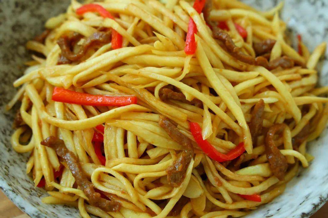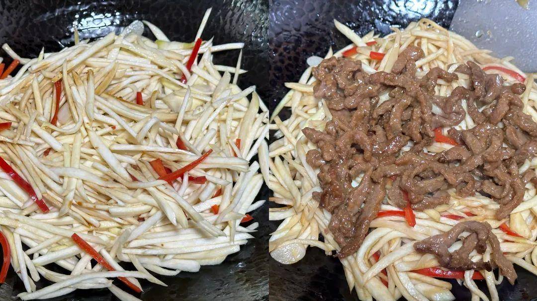 牛肉丝炒茭白,顾名思义,是将细嫩的牛肉丝与清脆的茭白丝巧妙结合,再辅以红椒的点缀,色彩上红绿白相间,清新悦目,仿佛夏日里的一抹凉风,瞬间吹散了心中的燥热。牛肉的醇香与茭白的清甜相互交织,形成了一种难以言喻的美味,让人一尝难忘。
