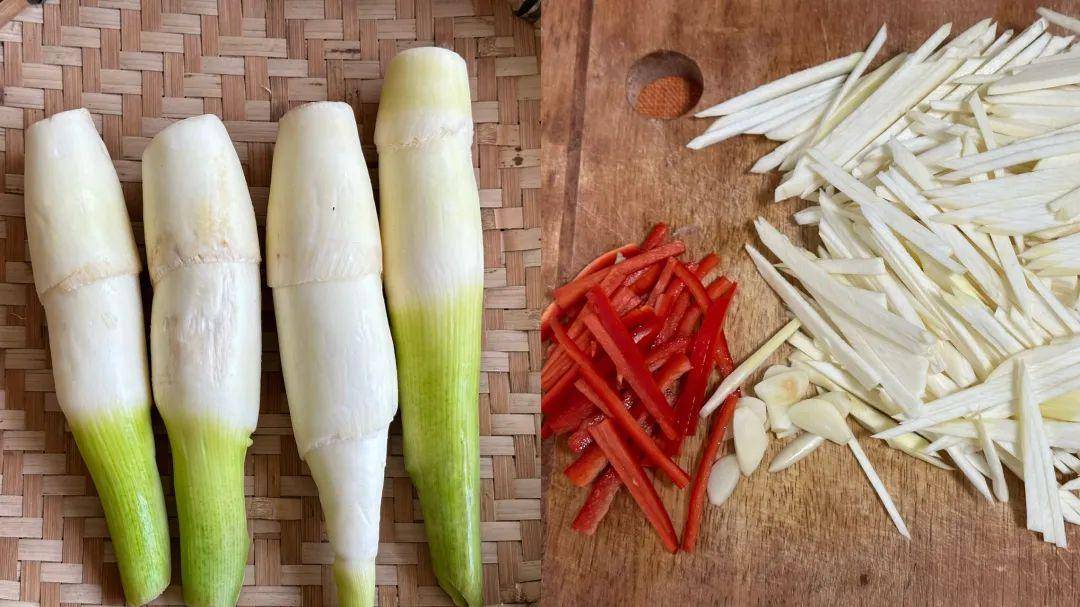 制作配料:茭白4个 生抽2勺 盐1勺 蚝油1勺 淀粉1勺 白胡椒粉1克 红椒半个 大蒜2个
