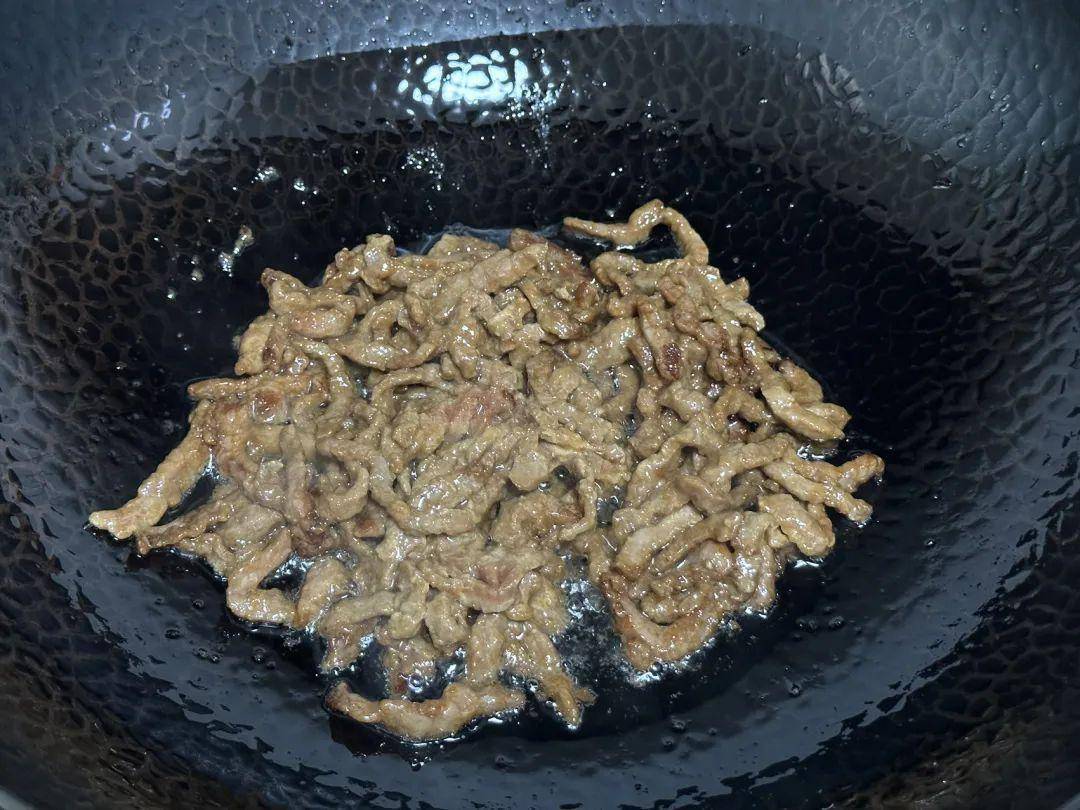 2、热锅凉油,下牛肉丝翻炒至变色盛出备用;牛肉下锅之后不要急着翻动,等到定型之后再翻动就不会粘锅底了;