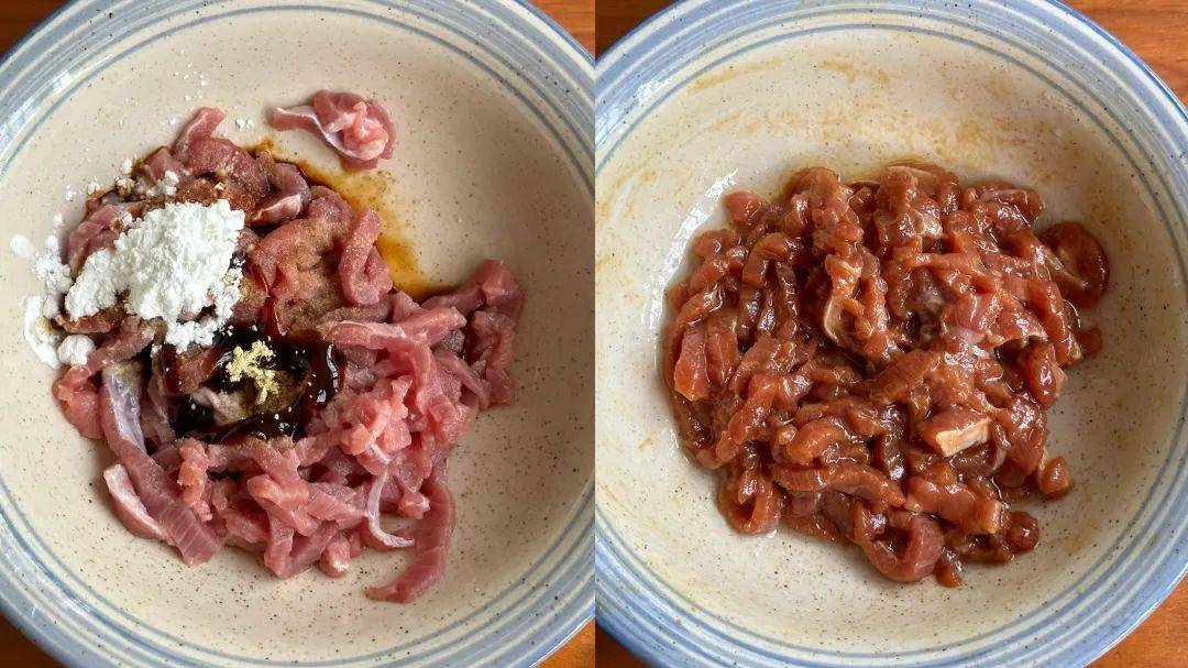 1、提前把肉牛逆着纹理切丝,装在碗中,加入生抽、蚝油、白胡椒粉、淀粉抓拌均匀,最后用油封住水分,冷藏腌制2个小时以上;