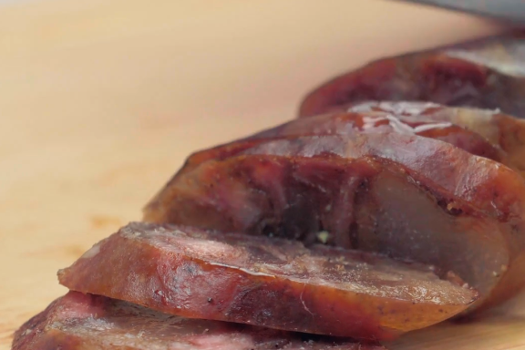 准备2根腊肠,没有腊肠的朋友,用普通的香肠代替即可。腊肠清洗干净之后,同样用刀切成薄片备用。