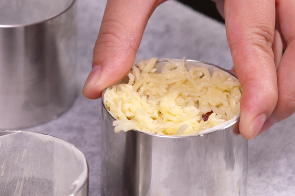 准备一个慕斯圈,或者深一点的平底容器,在容器的周围刷上一层熟油,然后
