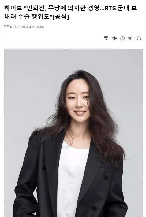 搜狐娱乐讯 4月25日,据韩媒报道,ADOR代表闵熙珍召开记者发布会。HYBE方面表示闵熙珍曾接受女巫师的建议,履行人事招聘等公司经营事项。另外,HYBE方面还透露称闵熙珍就防弹少年团成员的兵役问题咨询过巫婆,对方的回答是“去”。闵熙珍还进行过暗示咒术行为的发言:“没有他们好像对我更有利。