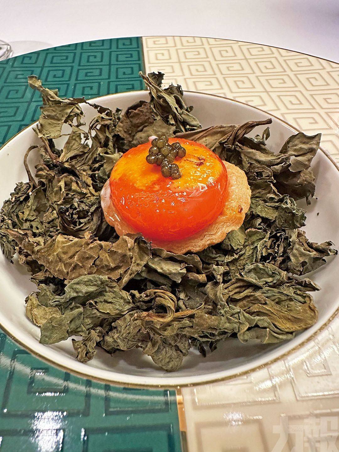 「油封魚子醬蛋撻」以撻底加入葡腸及炒香的洋蔥,再放上日本蘭王生蛋及魚子醬,入口鹹香惹味,是一道充滿創意的新版葡撻。(本報攝)