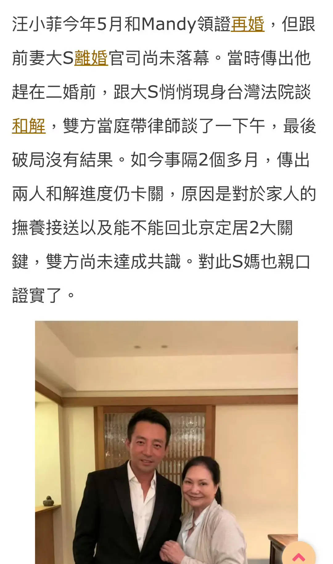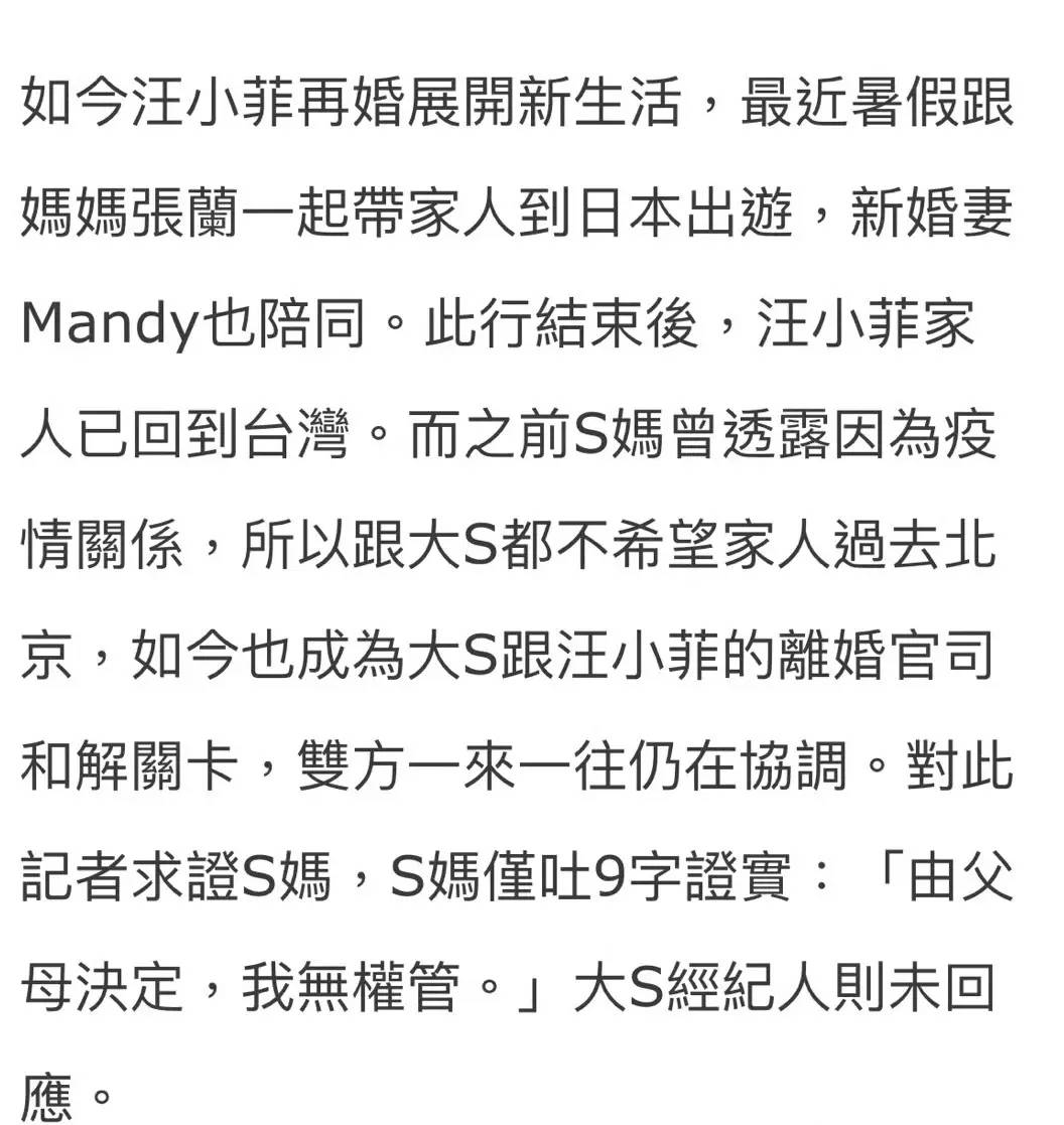 搜狐娱乐讯 7月11日,据台媒,大S与汪小菲的离婚官司和解失败,两人和解失败的主要原因是,对于家人的抚养接送以及能不能回北京定居两大关键,双方尚未达成共识。对此,S妈回复记者:“由父母决定,我无权管。”
