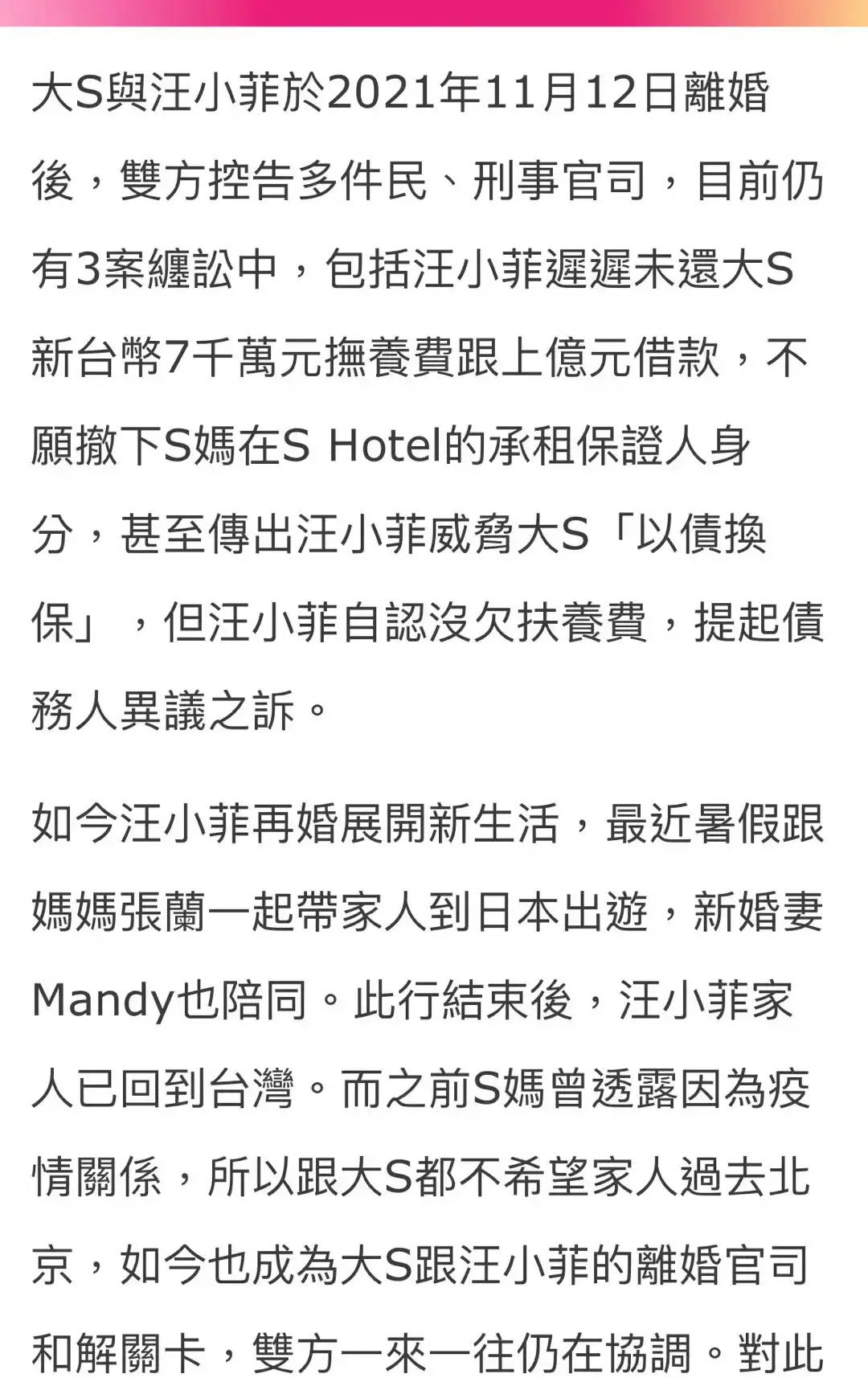 据悉,大S汪小菲两人仍有三案缠讼中,包括汪小菲迟迟未还大S新台币7千万元抚养费跟上亿元借款,不愿撤下S妈在S Hotel的承租保证人身分,但汪小菲自认没欠扶养费,提起债务人异议之诉。