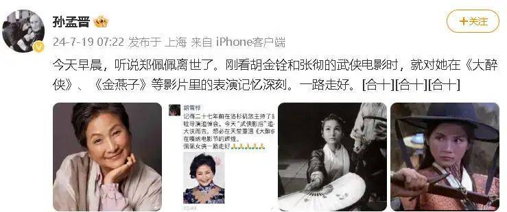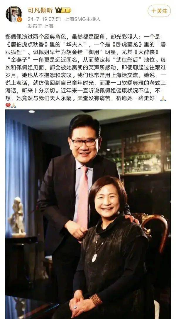 7月19日,导演孙孟晋在社交媒体上透露,郑佩佩于今日早晨去世,享年78岁。主持人曹可凡也发文称:“近年来一直听说佩佩姐健康状况不佳,不想,她竟然与我们天人永隔。天堂没有痛苦,祈愿她一路走好!”