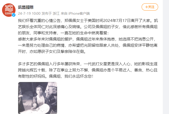随后,郑佩佩经纪公司发布公告证实去世消息:“郑佩佩女士于美国时间2024年7月17日离开了大家。”