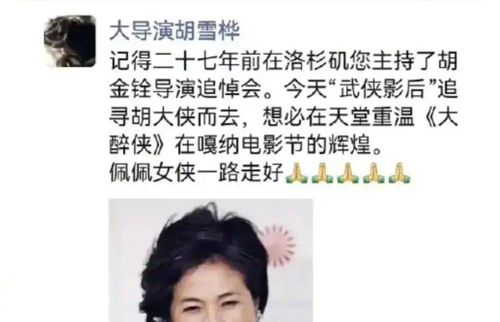 导演胡雪桦的朋友圈悼念截图也在网上曝光:“佩佩女侠一路走好”。