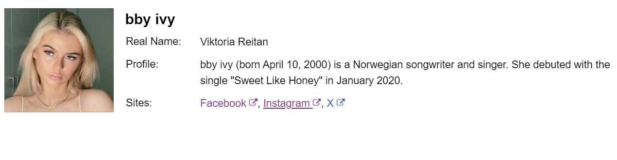 公开信息中,找不到Bby Ivy的百科介绍,有报道称,她今年21岁。不过,某些小媒体中有Bby Ivy的豆腐块简介。显示她出生于2000年,是一位小众挪威歌手,2018年推出首支单曲“Say It To My Face”。