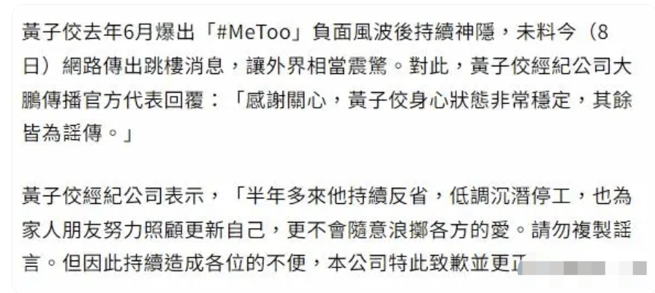 不过很快黄子佼的经纪公司出面否认,表示“感谢关心,黄子佼身心状态非常稳定,其余皆为谣传。”另外公司还透露了黄子佼的近况,表示他一直在停工反省中,呼吁外界请勿复制谣言。