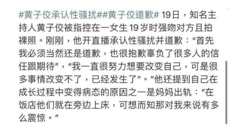 事情曝光后,网友们都在等黄子佼回应,没想到他一不做二不休直接开直播承认了这件事。不过黄子佼也为自己辩解,称自己之所以有这种病态癖好,是因为小时候亲眼目睹了自己母亲出轨,导致自己三观也被严重扭曲。