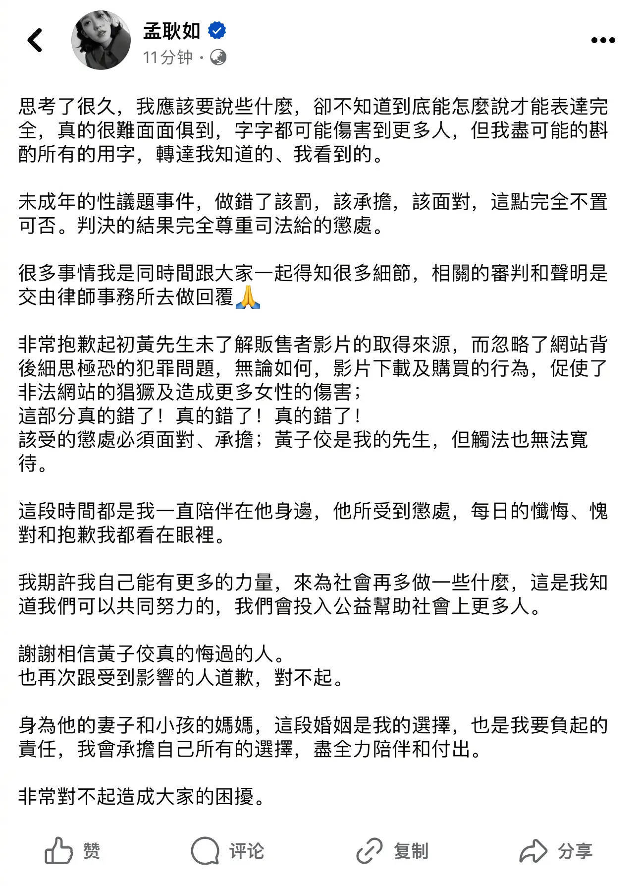 妻子孟耿如也发文道歉,表示“黄子佼真的做错了!很多事情自己也是同时间跟大家一起得知很多细节。黄子佼是我的先生,但触法也无法宽待”,另外孟耿如也表示这段婚姻是她的选择,她需要负起的责任,也会承担自己所有的选择,尽全力陪伴与付出,“谢谢相信黄子佼真的悔过的人。也再次跟受到影响的人道歉,对不起。非常对不起造成大家的困扰。”