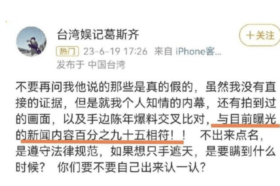 关于大小S姐妹吸毒一事,早在多年前就有过传闻。对于黄子佼的爆料,台湾知名狗仔葛斯齐上线回应,表示他爆料的内容有95%都相符。另外葛斯齐还内涵大小S,称自己不点名是遵守法律规范,如果想只手遮天是要隐瞒到什么时候?