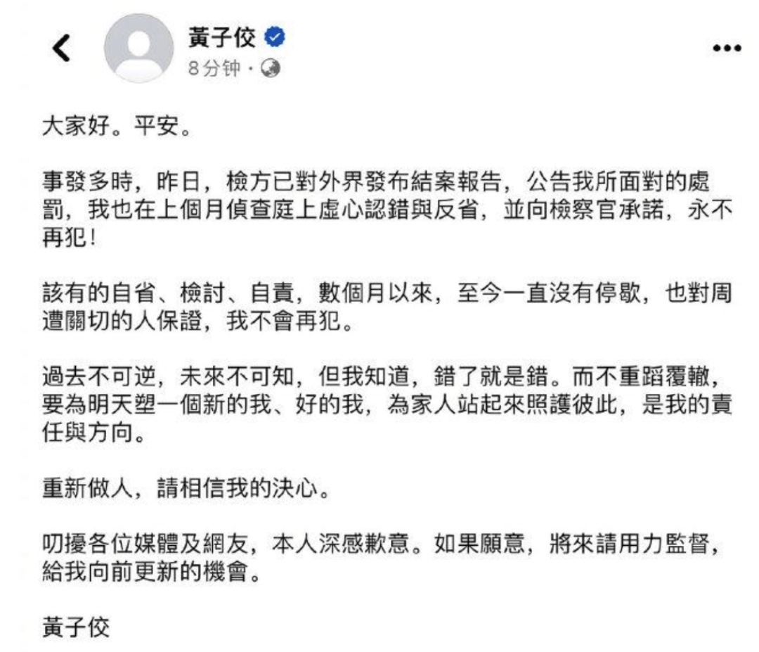 案件结案后,在4月4日清明节当天,黄子佼终于更新社交账号回应此事,表示:“数月以来一直在反省,检讨自己,错了就是错了,为了家人一定会塑造一个全新的自己,好的自己,一定会重新做人,请大家相信我的决心,也欢迎大家来监督,给我向前更新的机会。”